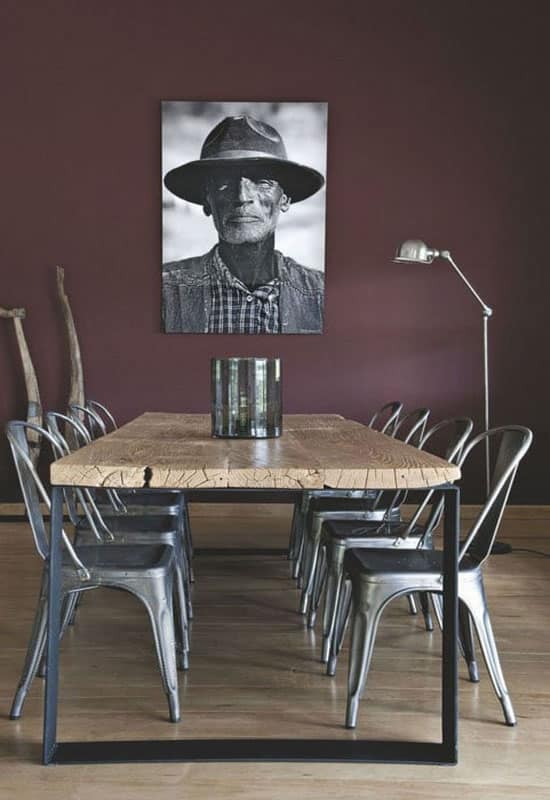 À l’arrivée on peut donc obtenir une association mur bordeaux/table en bois brut/chaises indus.