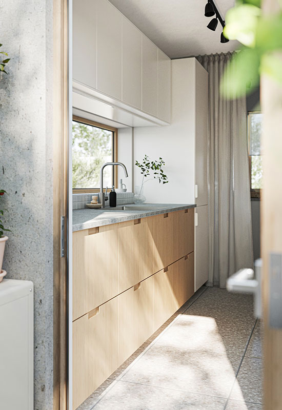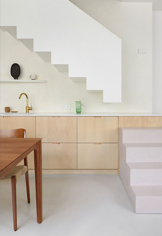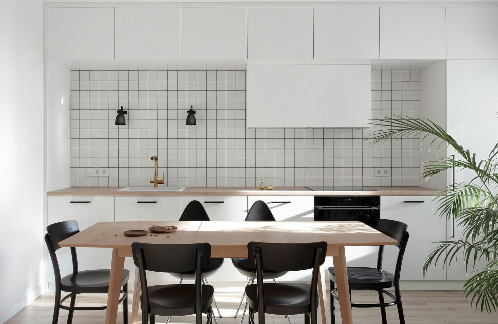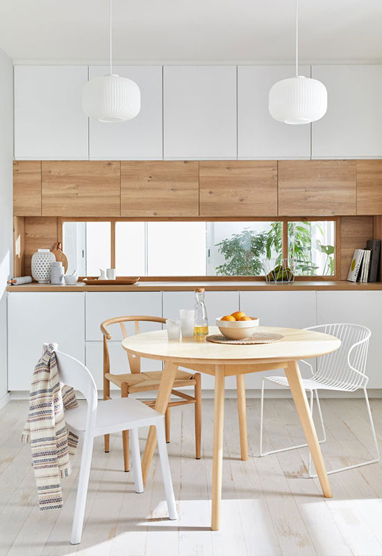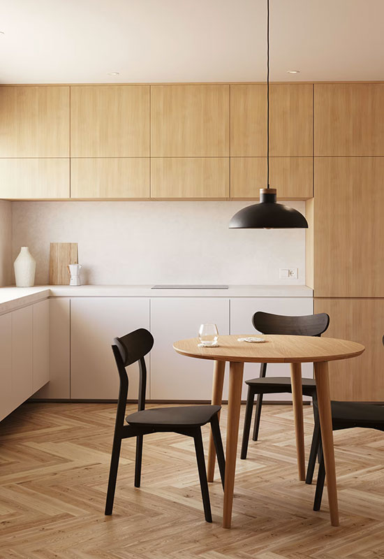 Il s’intègre au niveau des portes de placards, du plan de travail et du mobilier comme avec une table à manger scandinave.