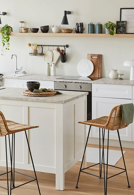 Pour une déco de cuisine cohérente, harmonisez les couleurs ou matières de l’îlot avec celle des placards autour.