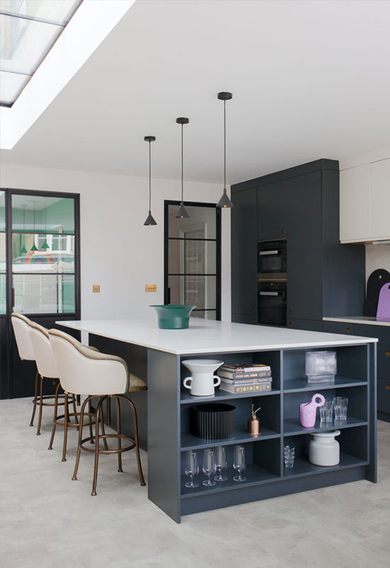 Entouré de chaises de bar confortables, l’îlot réunira les convives pour des repas sur le pouce ou des apéritifs improvisés