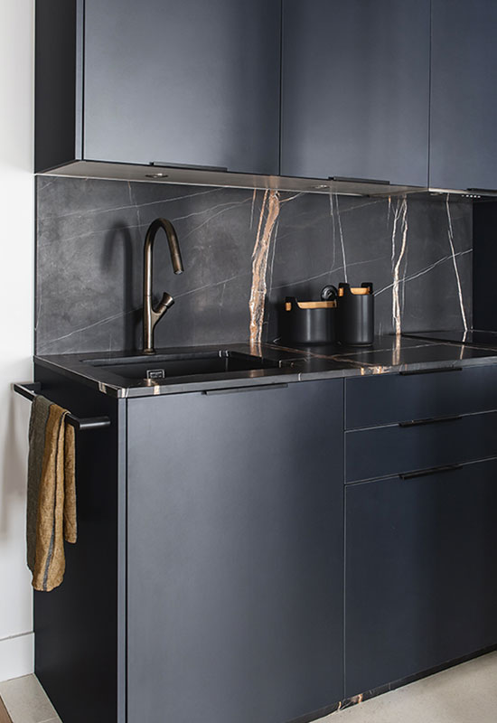 Le noir peut aussi donner vie à une ambiance chic et raffinée, associé à des touches dorées ou à du marbre sur la crédence ou le plan de travail.