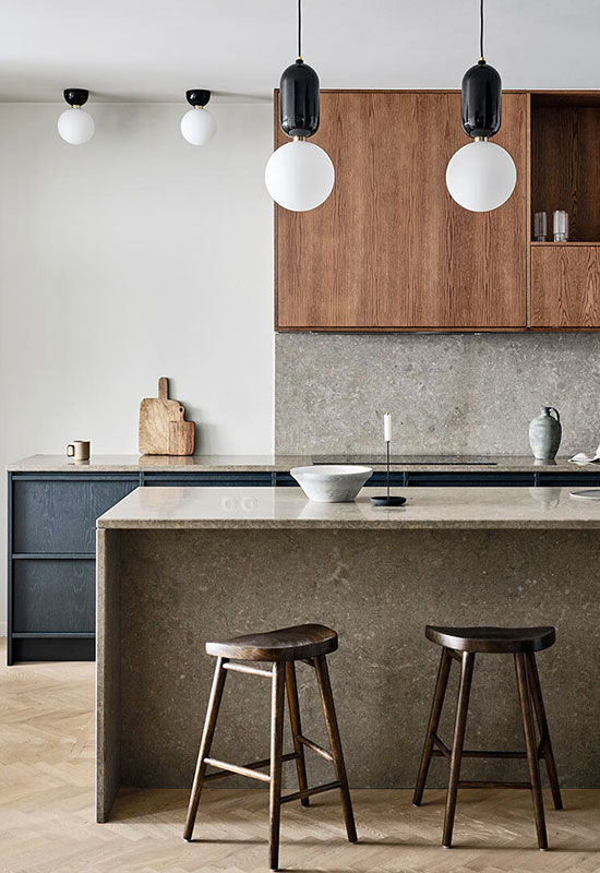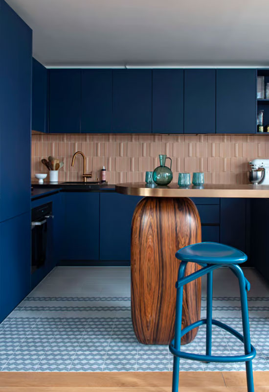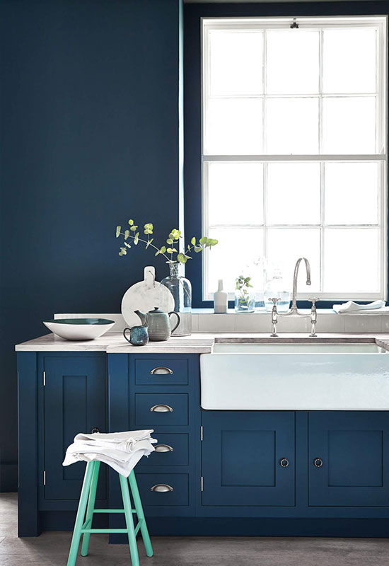 Le bleu foncé lui confère un rendu particulièrement élégant, marié à des matériaux nobles comme le bois massif, le marbre ou l’acier.