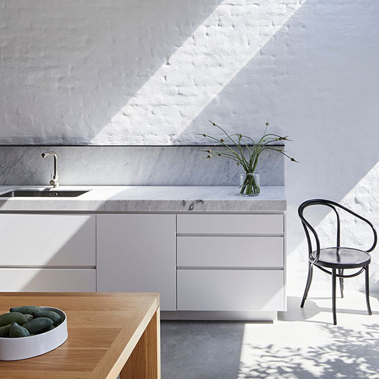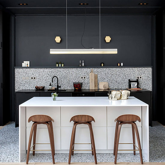 Un plan de travail en marbre ou en quartz apportera un caractère élégant et contemporain dans une cuisine blanche ou noire avec îlot central.
