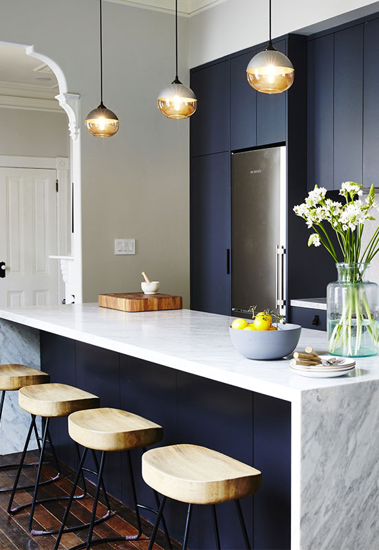 Pour une ambiance chic, intégrez quelques éléments dorés : poignées de cuisine en laiton sur des portes de placards bleu marine ou suspension dorée.