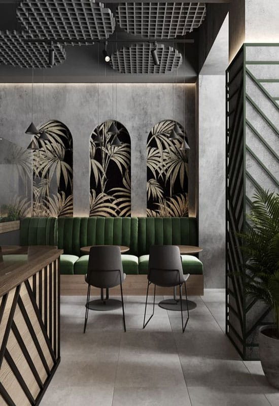 Pour exemple, voici un mix de jaune et de blanc sur les murs d’un café à la déco indus.