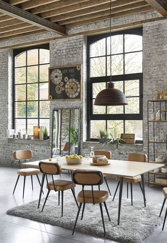Pour une salle à manger « indus » à souhait, choisissez une grande table aux matières robustes.