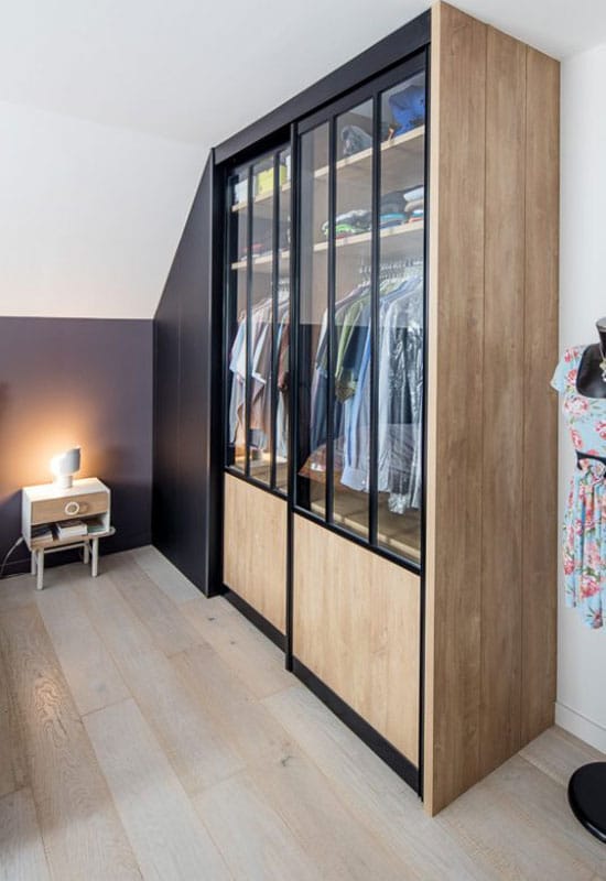 Un dressing ouvert alliant bois et métal est idéal : si cela est possible, laissez-y quelques espaces libres pour aérer l’espace visuel.