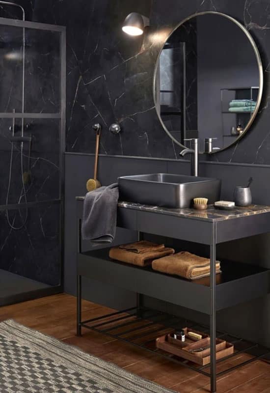 Mais vous créerez aussi une belle ambiance « indus » grâce à l’ardoise ou encore au carrelage ou au marbre noir.