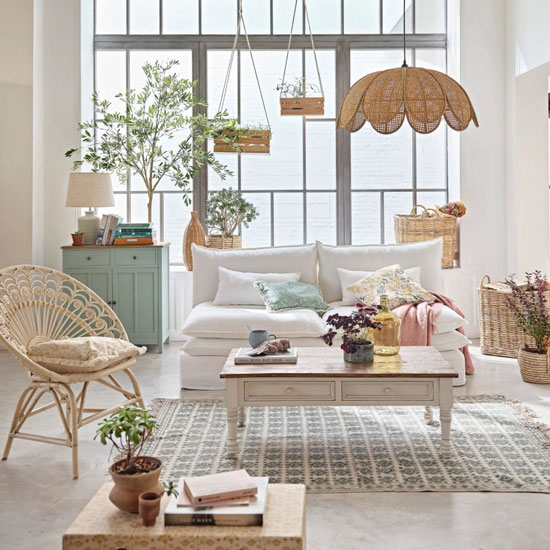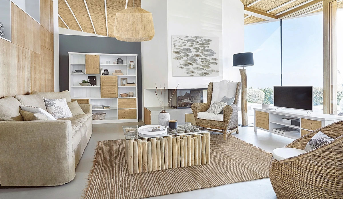 Au salon, privilégiez du mobilier aérien comme un fauteuil lounge, un buffet en cannage et une maxi lampe en rotin.