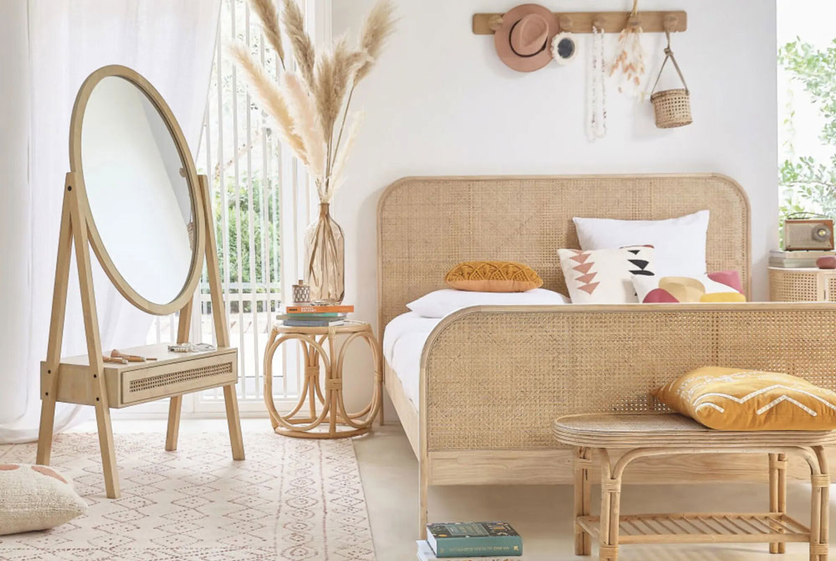 Pour une chambre cocooning, une tête de lit en rotin et une armoire en cannage sauront créer un coin nuit relaxant et dépaysant.