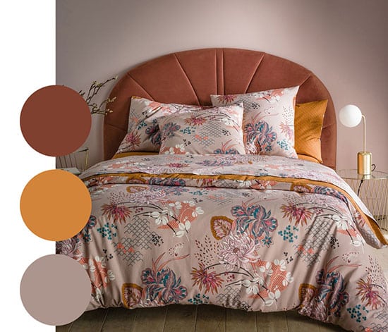 Elle réchauffe indéniablement l’atmosphère, d’autant qu’elle est associée à une parure de lit des plus chics aux motifs dépaysants.