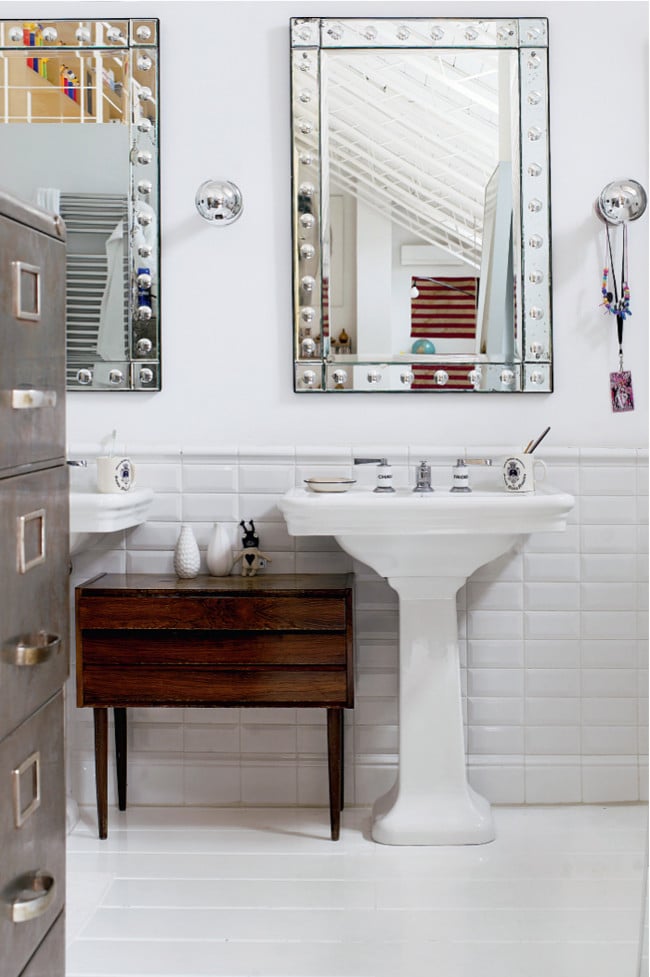 La salle de bain de l’appartement arbore quant à elle du carrelage métro et un duo de miroirs façon loge glamourissime !