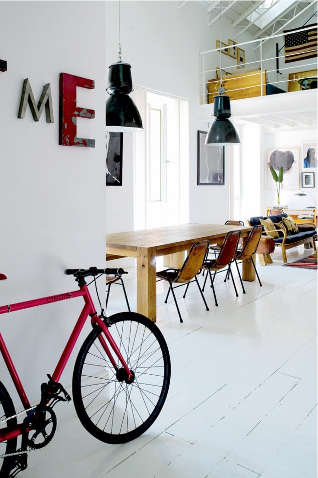 Les amateurs de style industriel auront sans nul doute reconnu la fameuse chaise Tolix, qui semble comme un poisson dans l’eau dans cette ambiance usine-pop.