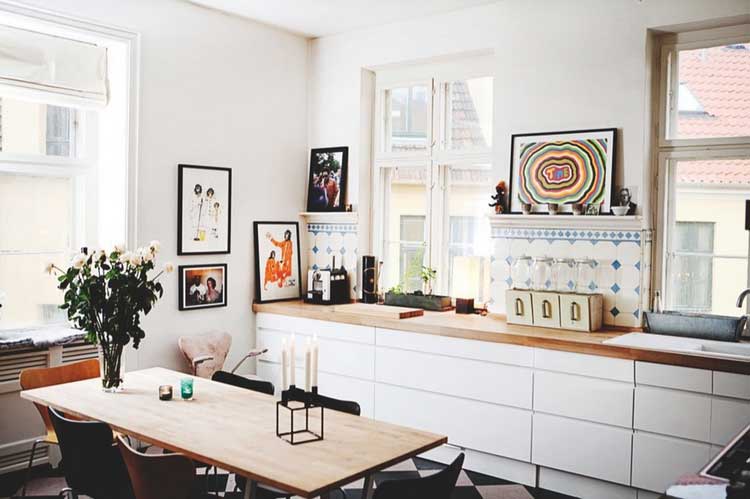 On retrouve des tableaux qui habillent la plupart des murs de l’appartement, qu’ils soient dans la pièce à vivre ou la cuisine, qui pour le coup constituent un écrin des plus inattendus !