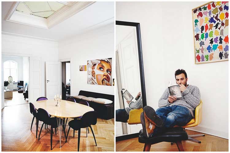 L’appartement en lui-même dispose d’un superbe cachet ainsi que de belles hauteurs sous plafond, de parquets d’origine et de moulures d’époques, sans parler de l’incroyable luminosité, dans laquelle les œuvres d’art et pièces vintage de notre hôte, sont d’autant plus mises en valeur.
