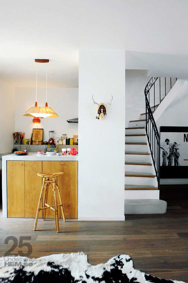 On y retrouve notamment du béton pour le plan de travail et une suspension exotique qui fait écho à un trophée de chasse pour le moins atypique !