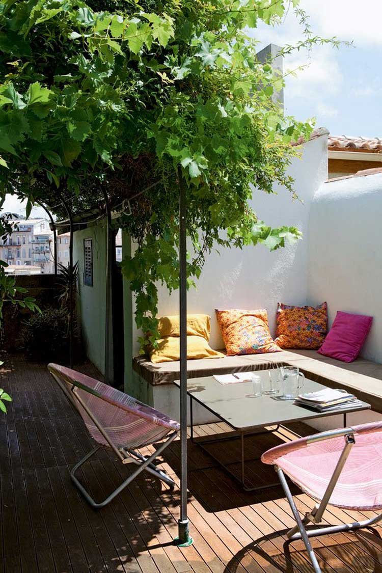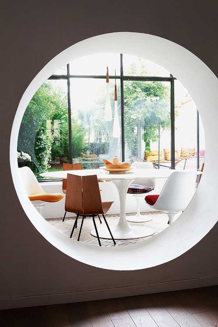 Intéressons-nous à présent à l’extérieur de la maison, où nous retrouvons une superbe véranda conçue à la façon d’une verrière atelier d’artiste qui révèle un ensemble table et chaises très 70′, donnant de l’autre côté de la lucarne.