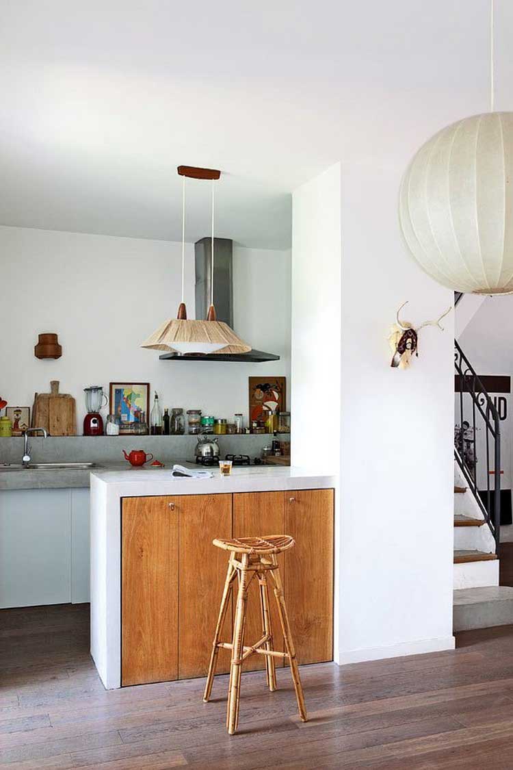 Le coin cuisine attenant, petit par la taille mais au rendu tout simplement bluffant, est tout à l’image de la maison et propose une alliance de styles et de matériaux très réussi.