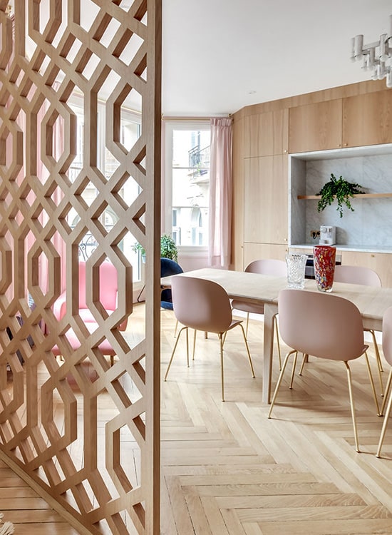 Graphique et chaleureux, le claustra intérieur est parfait comme séparation entre 2 espaces.