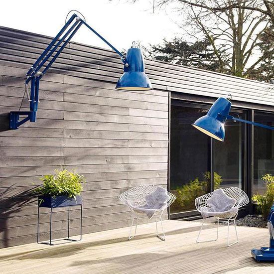 Ces luminaires rappellent les lampes d’architectes et apportent un style industriel et moderne sur une grande terrasse.