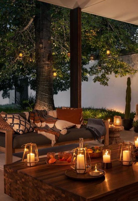 Les lanternes de jardin sont une solution d’éclairage d’extérieur très accessible, niveau budget, en apportant de la chaleur et un côté « cosy » à votre terrasse.