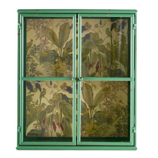 En ce qui concerne cette étagère, vous pouvez difficilement faire fausse route, avec sa structure en métal vieilli, son coloris vert, ses portes en verre et surtout son fond à l’imprimé feuillage.