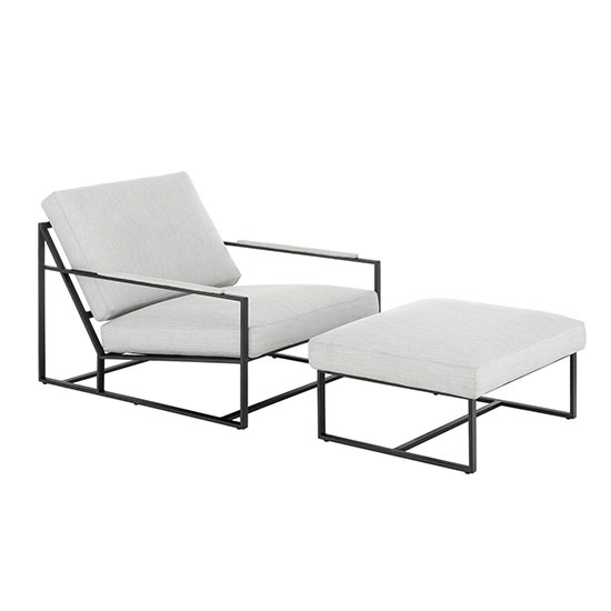 Ce fauteuil et son repose pieds affichent un design moderne aux lignes géométriques.