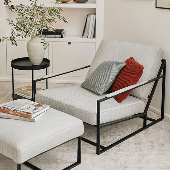 Le tout complété par son petit repose pieds matelassé, qui peut aussi se transformer en tabouret ou en bout de canapé style scandinave.
