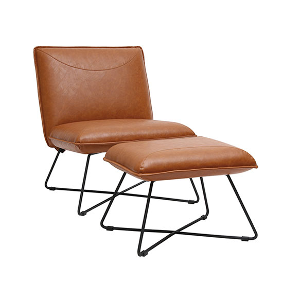 Le piètement métallique filaire en étoile soutient une assise et un repose pieds au coloris chaleureux, en assurant une parfaite stabilité.