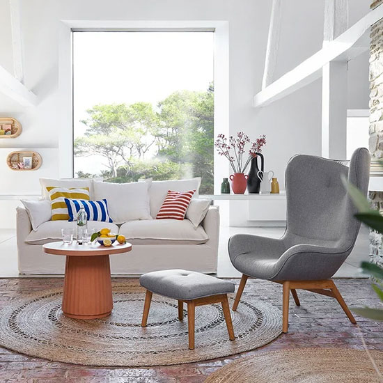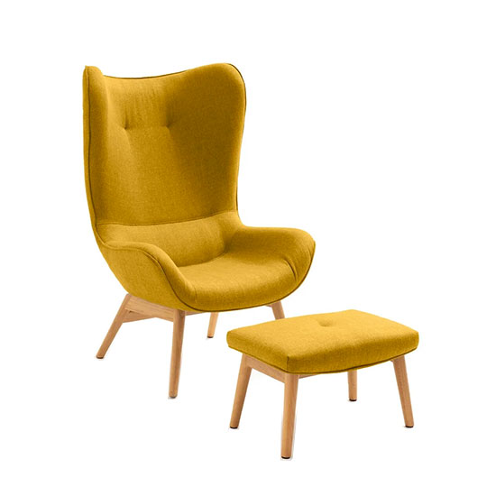 Si vous voulez donner du peps à votre déco, craquez pour ce fauteuil à oreilles et son repose pieds, disponible en jaune moutarde ou gris clair.