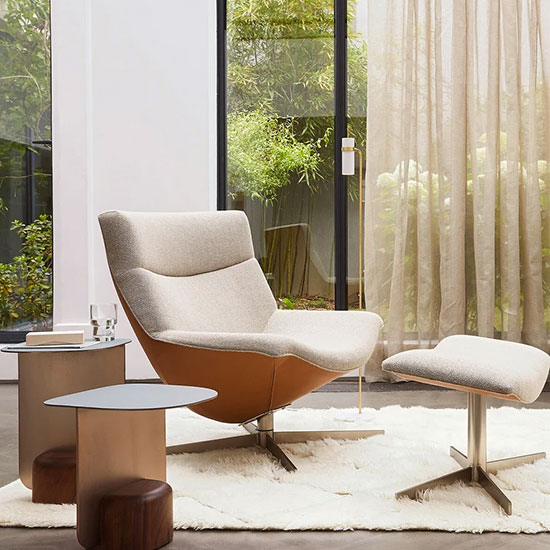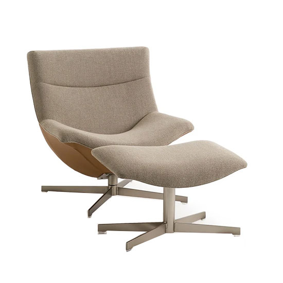 Forme organique, rembourrage généreux et assise pivotante : ce fauteuil contemporain avec repos pieds est pensé pour le confort.