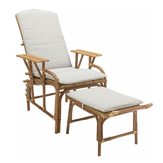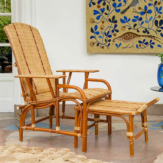 Les férus d’ambiance rétro et d’objets authentiques ne pourront détourner les yeux de cette chaise longue en rotin avec repose pieds assorti.