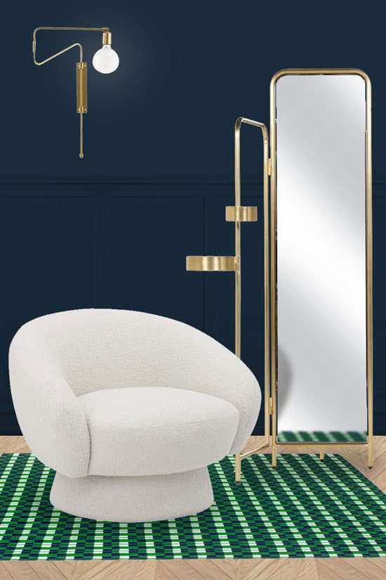 Côté accessoires, le laiton fera des merveilles pour souligner le potentiel rétro de ce fauteuil.