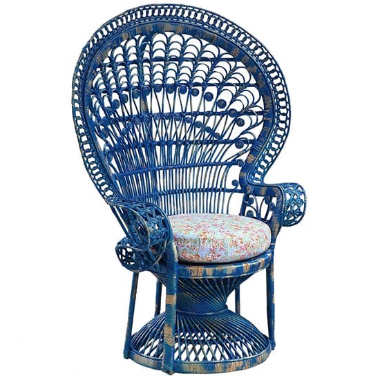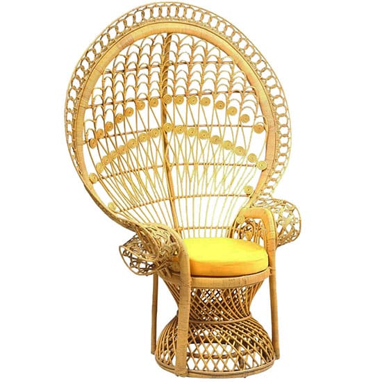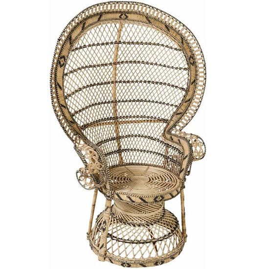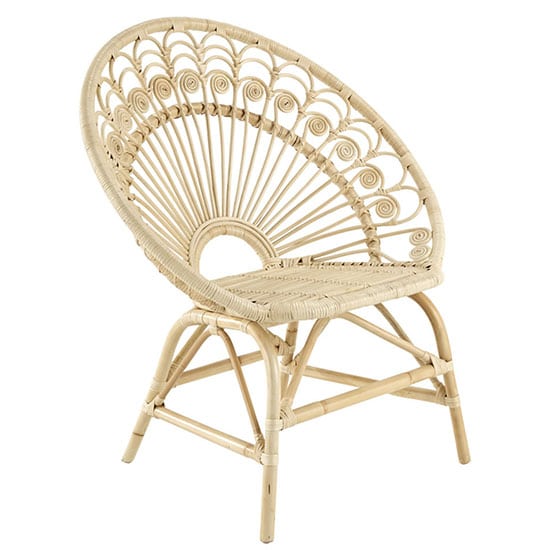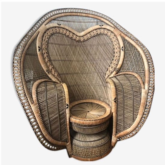 Voilà une origine qui explique ses allures de trône d’apparat : volume imposant, tressage traditionnel en dentelle de rotin aux motifs de plumes de paon ajourées, majestueux dossier enveloppant…
