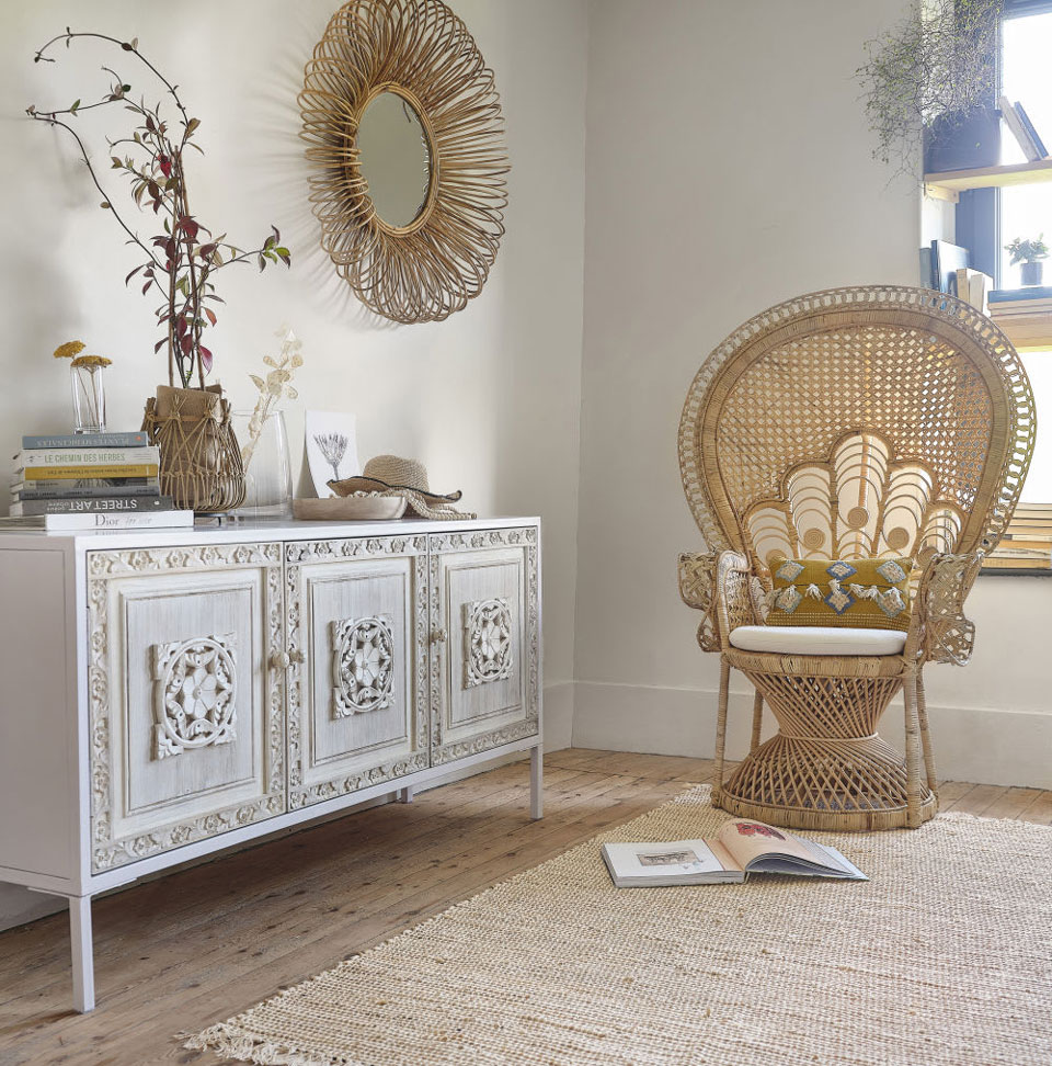 Aux côtés d’autres meubles en rotin, de paniers en osier tressé, de miroirs patinés et d’objets chinés variés, il fera fureur.