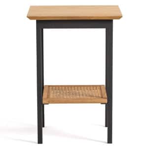 Alliant chêne, cannage et métal, ce guéridon est composé de tous les matériaux tendance en déco.