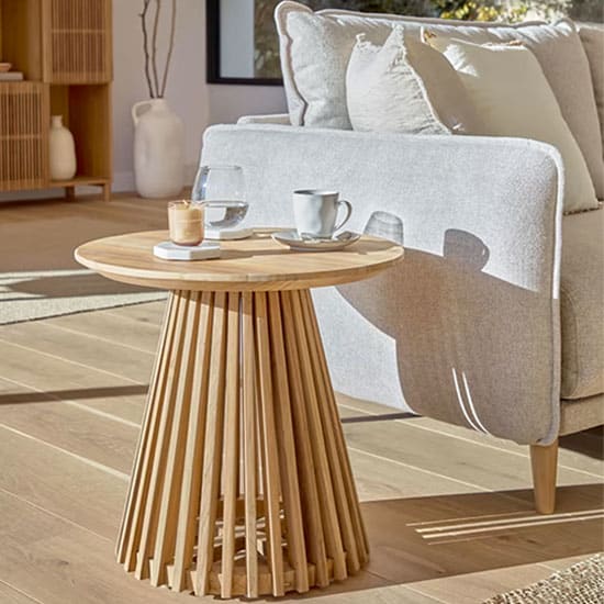 Le guéridon en bois peut servir de bout de canapé ou même de table de chevet.