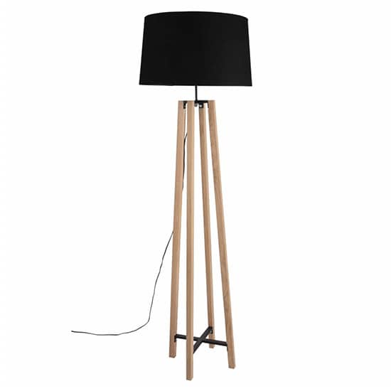 Son piètement naturel se pare d’un abat-jour cylindrique en tissu noir, pour une allure chic et contrastée.