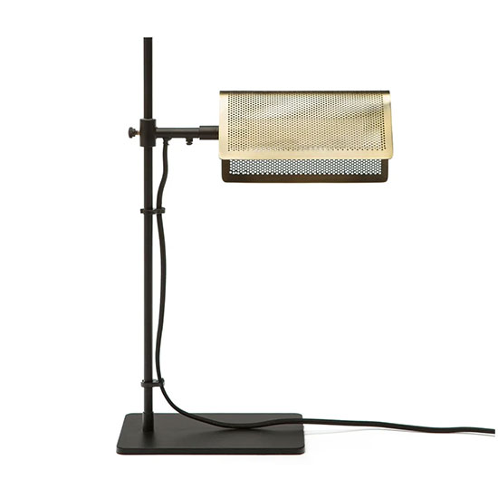 Description : Une lampe de bureau en laiton et métal noir avec un abat-jour orientable.