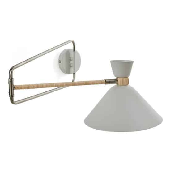Elle se compose d’une structure mobile en métal, d’un bras articulé gainé de rotin et d’un diffuseur conique blanc orientable.
