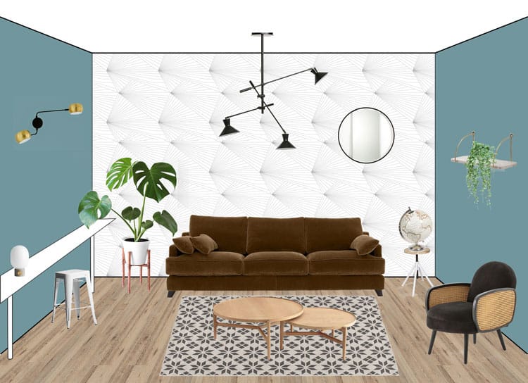 Pour le rendu géométrique du sol, des carreaux de ciment seront idéaux mais vous pourrez tout autant envisager un tapis créant le même effet.