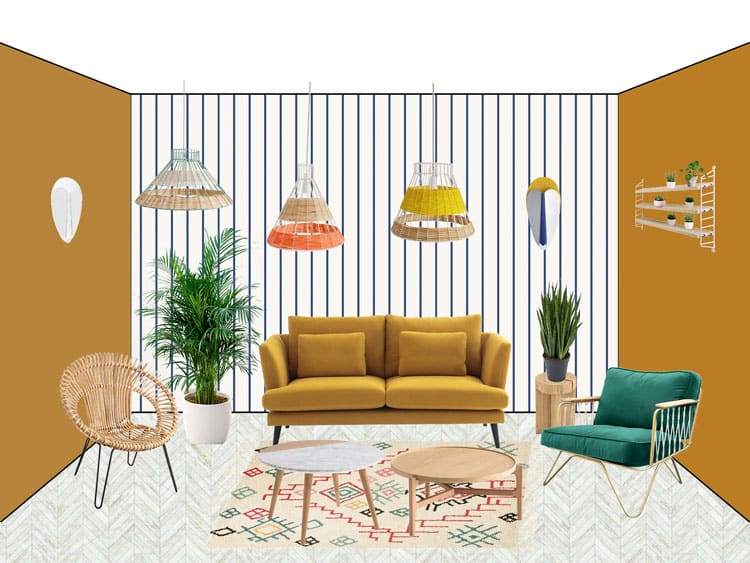 Côté couleurs, le jaune moutarde et le vert associés rehausseront le ton et n’oubliez pas les plantes vertes que vous pourrez envisager en pots ou sur une étagère string au design intemporel.