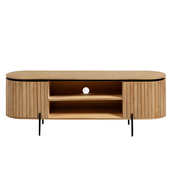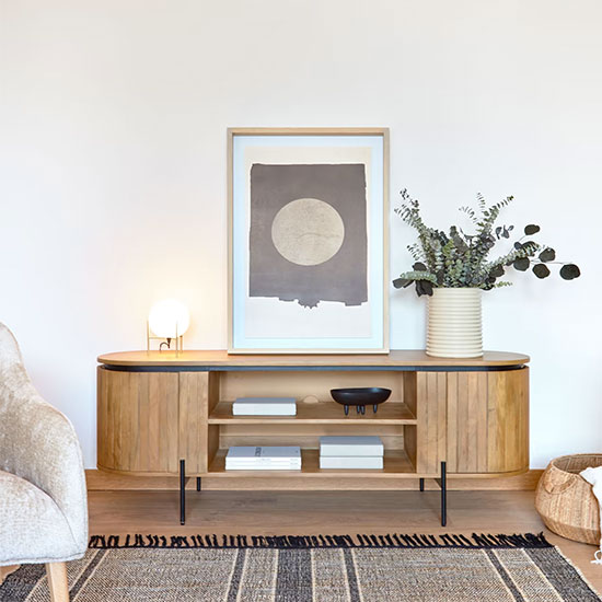 Ce meuble tv en bois est compose de pieces de manguier posées une à une pour créer sa jolie forme arrondie.