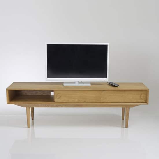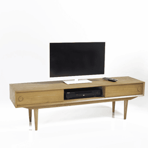 Un design sans fioritures délicieusement rétro, une finition chêne et des espaces de rangement dissimulés derrières deux portes coulissantes, que demander de mieux ?