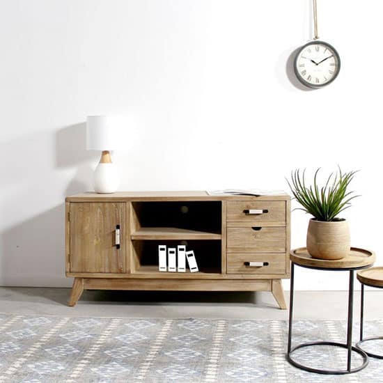 Un meuble télé buffet à la finition brossée, abritant de nombreux rangements, car il compte pas moins d’une porte, de deux niches et de trois tiroirs.