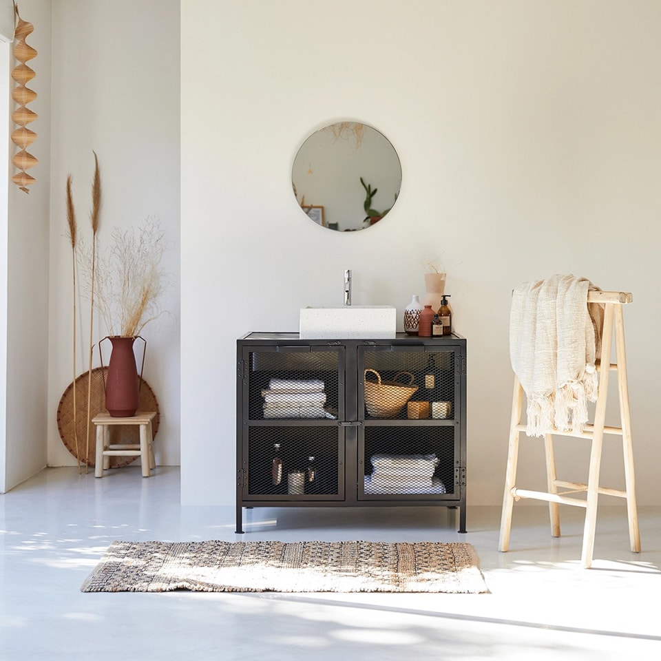 Ce meuble original fera la différence avec ses portes grillagées qui dissimulent discrètement 4 casiers pratiques pour ranger le nécessaire de toilette et les cosmétiques.