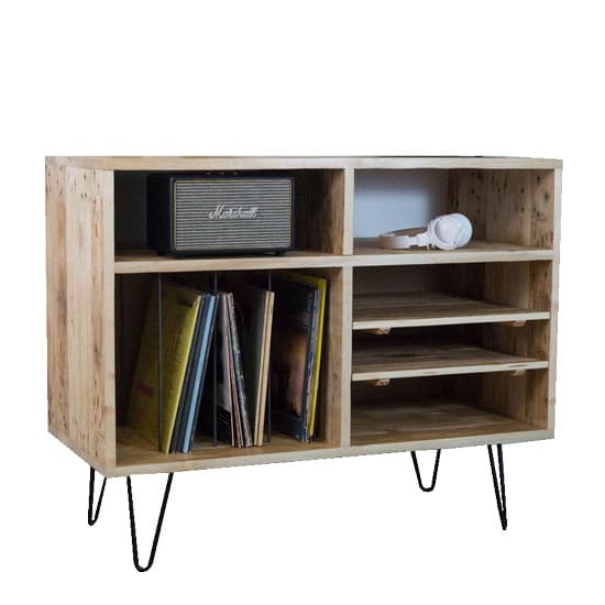 Ce buffet en manguier massif offre un large plateau pour accueillir platine et accessoires de musique.
