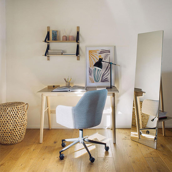Son fin piètement arrière est compact, si bien que le miroir s’intègre aisément dans une petite chambre.