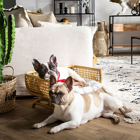 La structure tout en rotin et les pieds en demi-lune donnent à cette corbeille pour chien un air vintage qu’on adore.