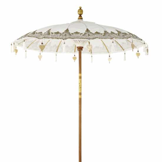 Cette ombrelle est dépaysante avec son contraste de toile en coton blanc et doré et son pied en bois.